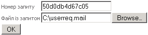 - Абонент обирає пункт меню "Персональний сертифікат / Завантажити файл із запитом", заповнює форму, вказуючи серійний номер запиту і ім'я файлу із запитом