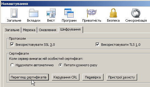 - У вікні, вибрати "Додатково / Шифрування / Перегляд сертифікатів"